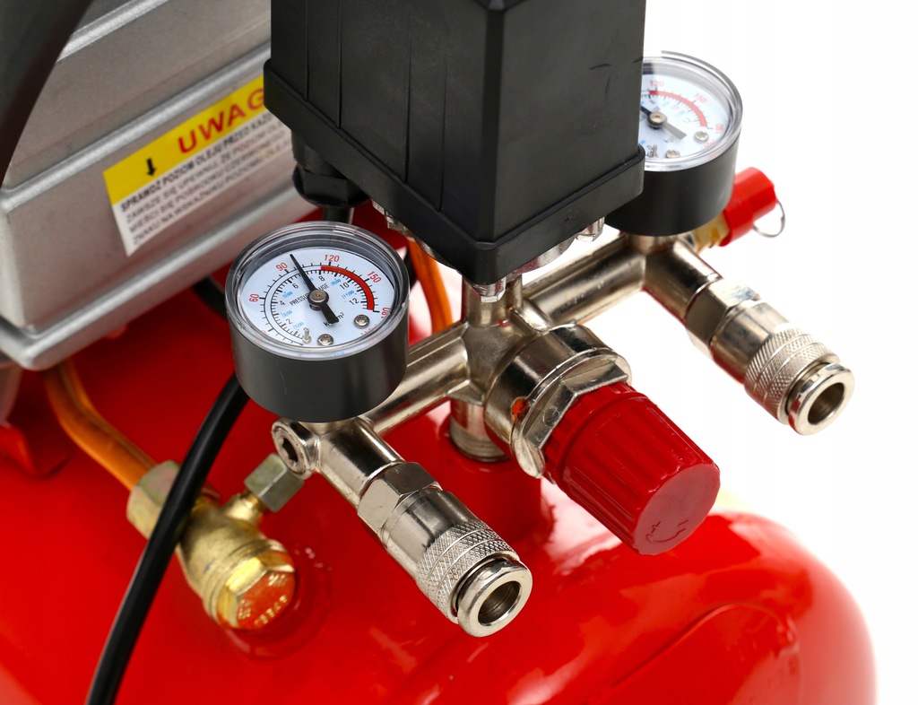 Kompresor posiada zawór bezpieczeństwa i dwa duże manometry Posiada zawór bezpieczeństwa, który służy do awaryjnego spuszczania nadmiaru powietrza z butli kompresora zapobiegając uszkodzeniu butli lub instalacji.