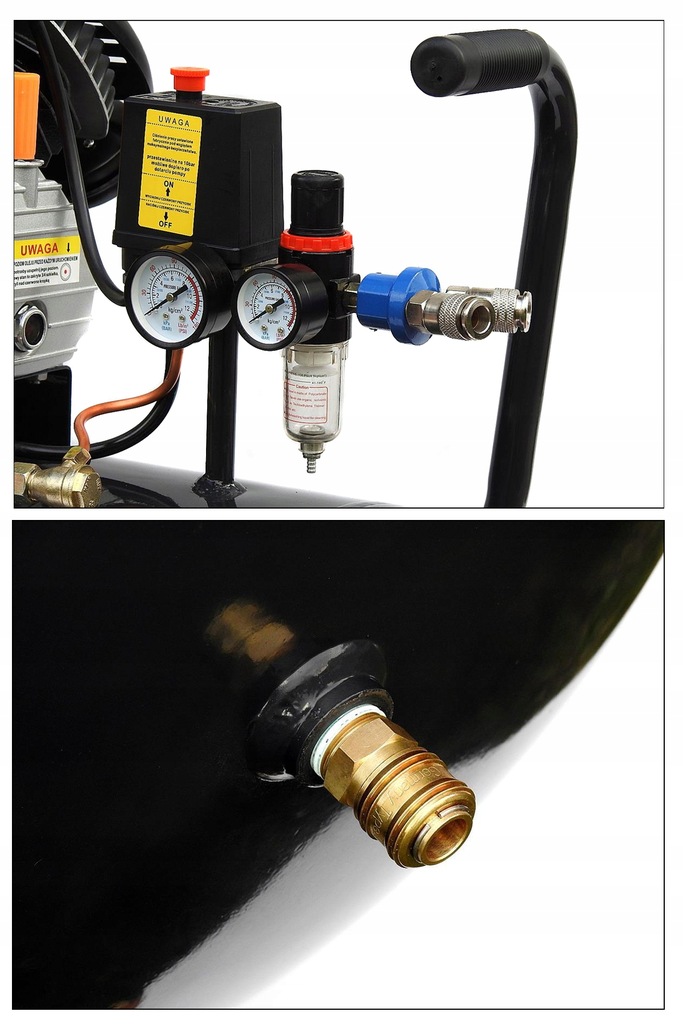 Wbudowany reduktor ciśnienia z filtrem odwadniającym ! Idealny do lakierowania ! TYLKO U NAS!! ELEMENT NIEZBĘDNY W PRACACH LAKIERNICZYCH! Każda sprężarka w zestawie posiada separator z odwadniaczem. Element ten wyłapuje wszelkie zanieczyszczenia z powietrza wylotowego (woda, olej, substancje stałe). Posiada pojemny zbiorniczek oraz ręczny zawór do spustu kondensatu-zanieczyszczeń. Praktyczna rączka transportowa z gumowanym, antypoślizgowym wykończeniem